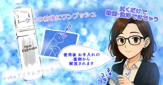 特に愛用しているのが irohaのアイテムクリーナー。ワンプッシュでふわふわの泡が出て、ティッシュで拭き取るだけ。銀イオンとマイルドな殺菌成分入りで、しっかり除菌しつつ肌にもやさしいから安心なんです。「清潔にしてあげたい」って思えるケアがあると、気持ちの面でも全然違いますよ。